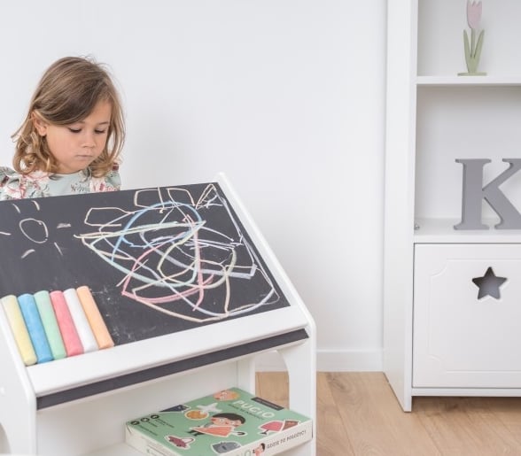 Модерна мебел за детската стая. Къщата разполага с рафтове и работен плот, където детето може да твори, да реди своите книжки или да се храни. Допълнително предимство на къщичката е, че едната страна е черна дъска, на която детето може да пише с тебешир и да играе на различни ученически занимания.